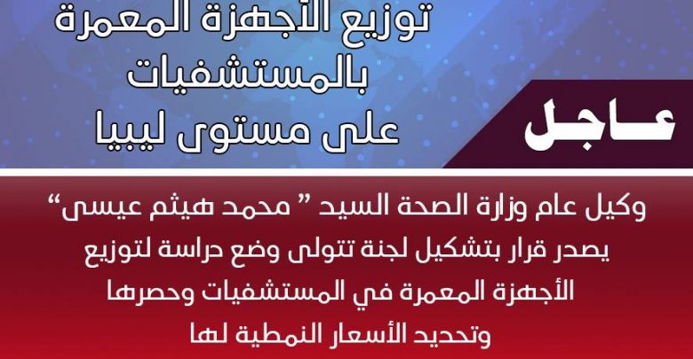 أصدر وكيل عام وزارة الصحة مؤخرا ، قرارًا يقضي بتشكيل لجنة تتولى وضع دراسة لتوزيع الأجهزة الطبية المعمرة بالمستشفيات على مستوى الدولة الليبية .