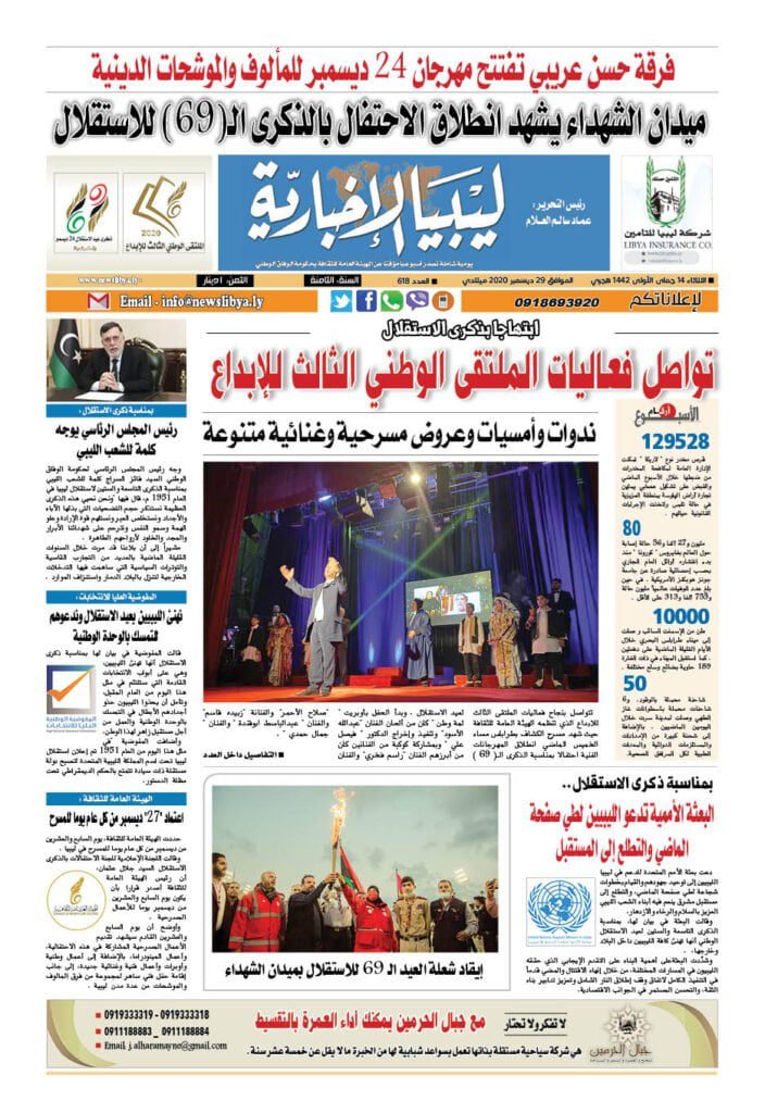 عن الهيئة العامة للثقافة يصدر صباح غدٍاً الثلاثاء 29 ديسمبر 2020م العدد (618) من صحيفة ليبيا الإخبارية