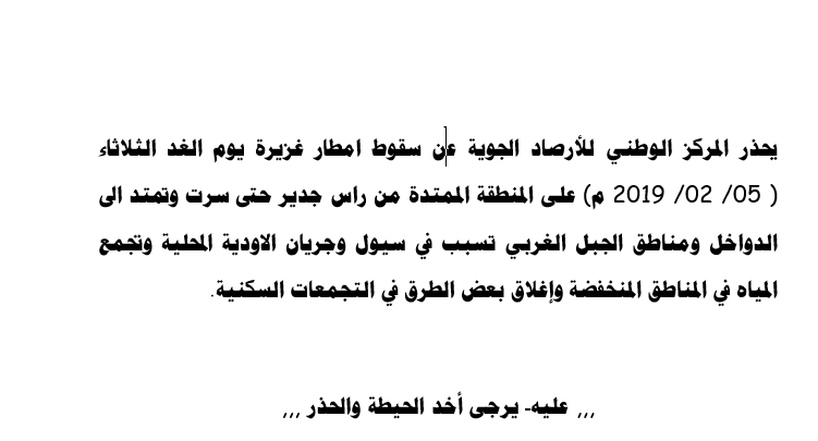 يحذر المركز الوطني للأرصاد الجوية عن سقوط امطار غزيرة يوم الغد الثلاثاء ( 05/ 02/ 2019 م) على المنطقة الممتدة من راس جدير حتى سرت وتمتد الى الدواخل ومناطق الجبل الغربي تسبب في سيول وجريان الاودية المحلية وتجمع المياه في المناطق المنخفضة وإغلاق بعض الطرق في التجمعات السكنية.