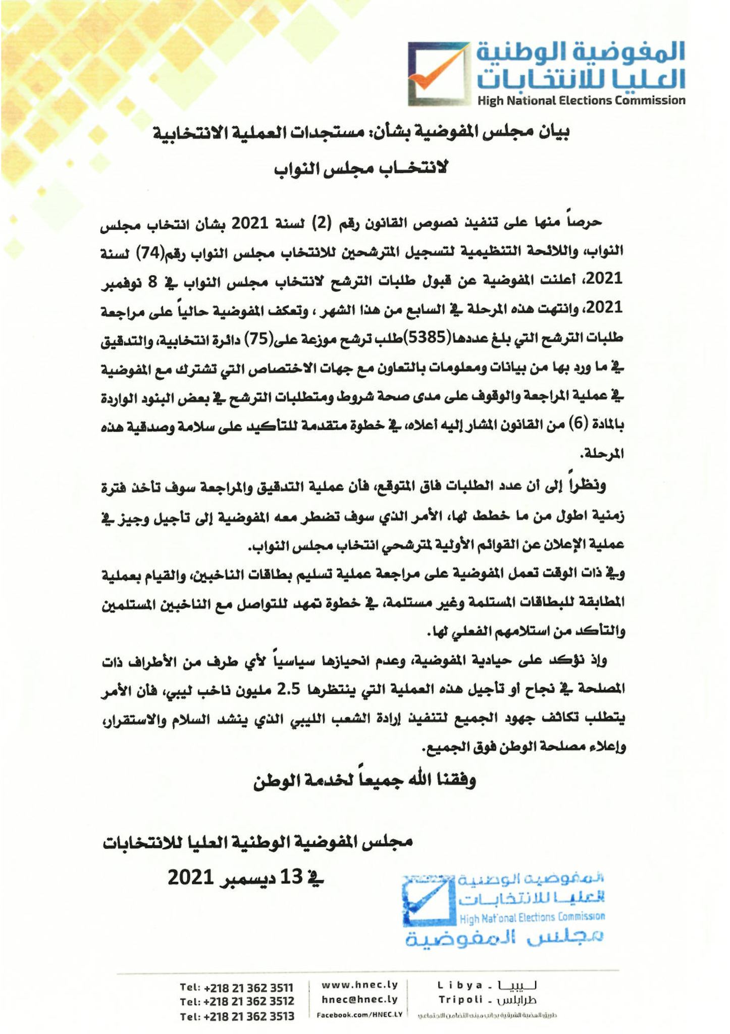 ودعت المفوضية إلى تكاثف جهود الجميع لتنفيذ إرادة الشعب الليبي الذي ينشد السلام والاستقرار، وإعلاء مصلحة الوطن فوق الجميع.