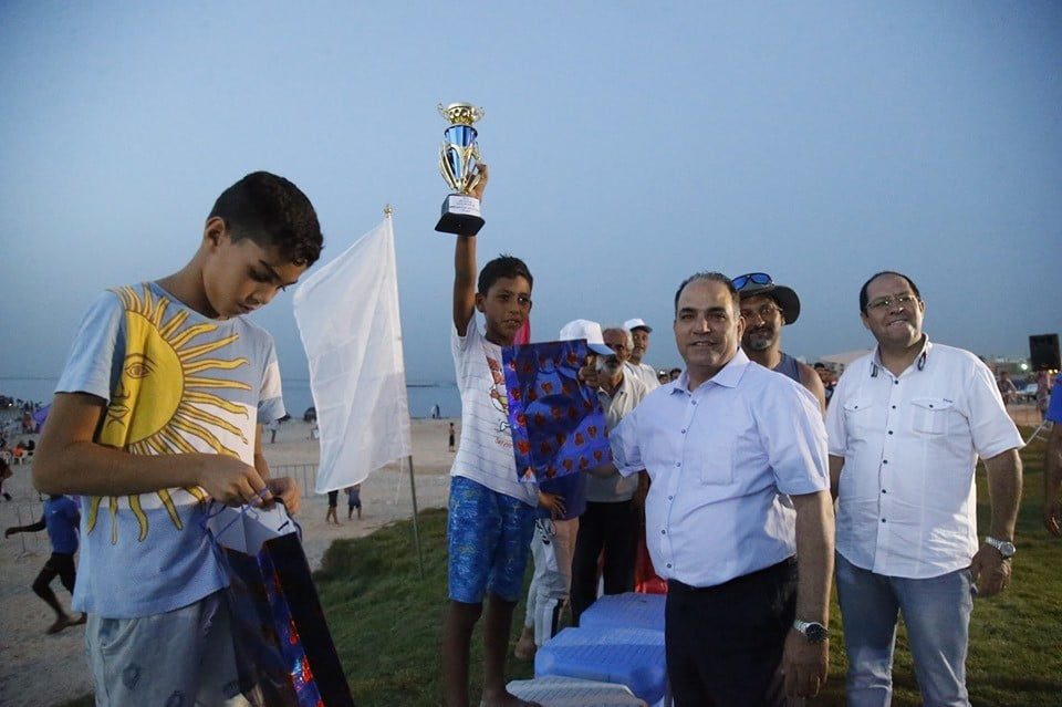 وفى ختام السباقات وبحضور رئيس هيئة الشباب والرياضة الدكتور بشير القنطري وبعض الأخوة الضيوف وعدد كبير من الوسائل الإعلامية والمصطافين والمهتمين بالألعاب البحرية اقيم حفل توزيع الكؤوس والجوائز التشجيعية على الرياضيين والفرق المتفوقة بالتراتيب الاولي