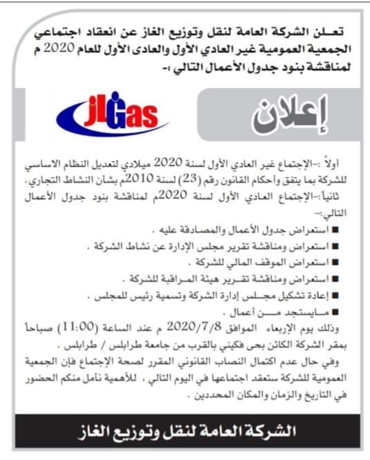الجمعية العمومية للشركة العامة لنقل وتوزيع الغاز مدعوة لإنعقاد اجتماعيّ الجمعية العمومية غير العادي الأول والعادي الأول للعام 2020 م . وذلك يوم الإربعاء 2020/7/8 . على تمام الساعة الحادية عشر صباحاً بمقر الشركة الكائن بجي فكيني بالقرب من جامعة طرابلس / طرابلس .