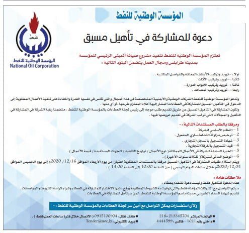 وتدعو المؤسسة الوطنية للنفط الشركات الوطنية والأجنبية المتخصصة في هذا المجال والتي تأنس في نفسها القدرة والكفاءة على تنفيذ الأعمال المطلوبة إلى الدخول في التأهيل المسبق للمشاركة في العطاءات المشار إليها أعلاه المعتزم طرحها ، أو أي منها .