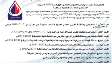 تعتبر الجمعية العمومية للشركة مدعوة للانعقاد يوم الأربعاء الموافق 31/3/2021م . ، على تمام الساعة الثانية عشر بعد الظهر بمقر الشركة الرئيسي الكائن بطرابلس قرقارش.