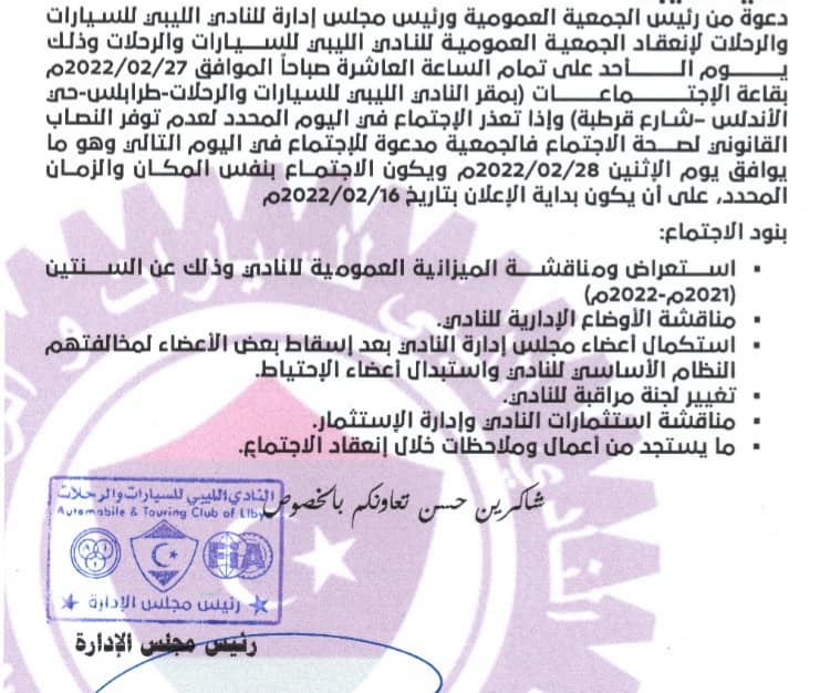 #إعلان دعوة لإنعقاد الجمعية العمومية للنادي الليبي للسيارات والرحلات