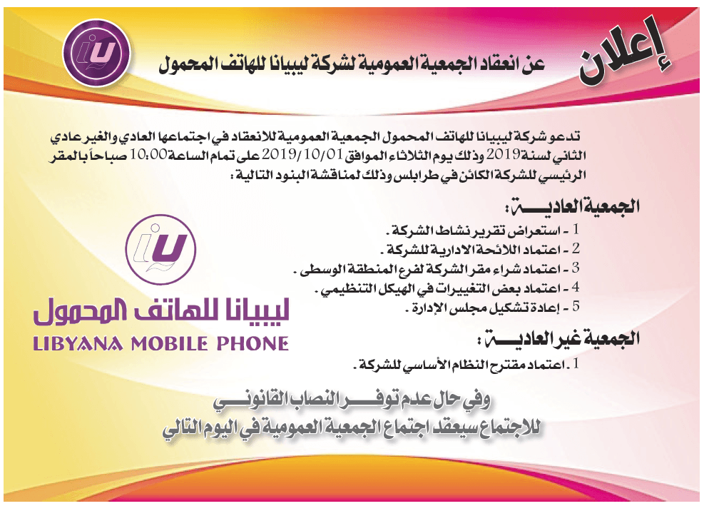 تدعو شركة ليبيانا للهاتف المحمول الجمعية العمومية للانعقاد في اجتماعها العادي والغير عادي الثاني لسنة 2019 وذلك يوم الثلاثاء الموافق 01/10/2019 على تمام الساعة 10:00 صباحاً بالمقر الرئيسي للشركة الكائن في طرابلس وذلك لمناقشة البنود التالية :