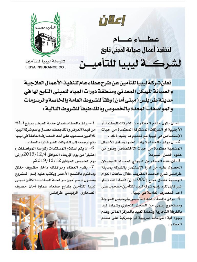 إعلان عن : عطاء عام لتنفيذ أعمال صيانة لمبنى تابع لشركة ليبيا للتأمين
