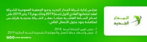 مجلس إدارة شركة المدار الجديد يدعو الجمعية العمومية للشركة لعقد إجتماعها العادي الأول لسنة 2019م وذلك يوم الأحد الموافق 13 يناير 2019م على تمام الساعة العاشرة صباحاً بمقر الشركة بمدينة طرابلس.