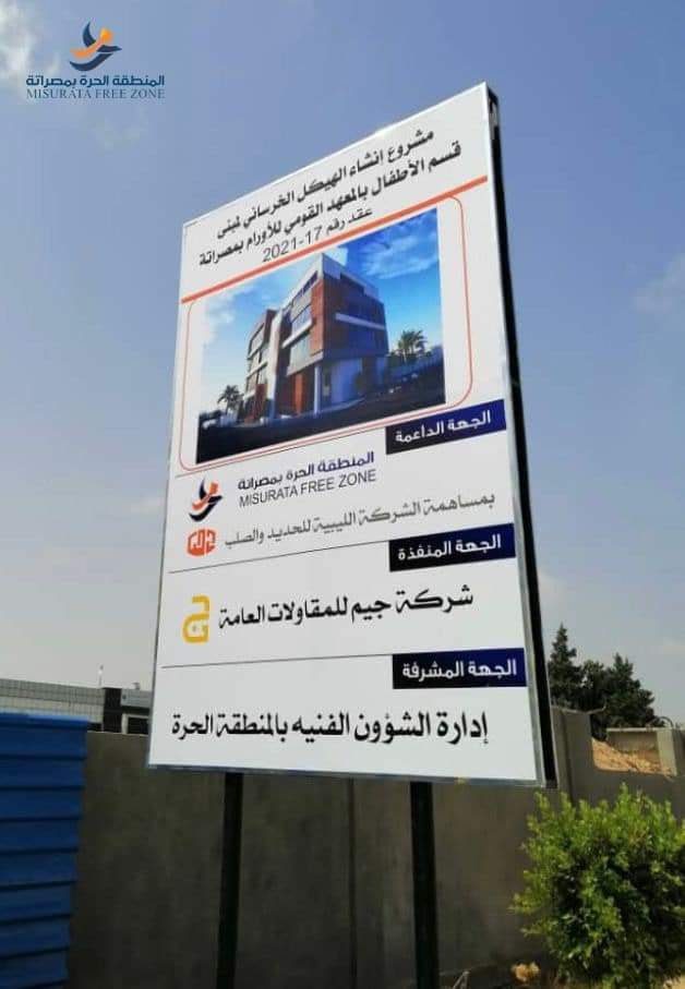 انطلقت هذا الاسبوع أعمال مشروع انشاء الهيكل الخرساني لمبنى قسم الأطفال بالمعهد القومي لعلاج الأورام بمصراتة، وهو المشروع الذي يحظى بدعم كامل من المنطقة الحرة بمصراتة مع مساهمة من الشركة الليبية الحديد والصلب