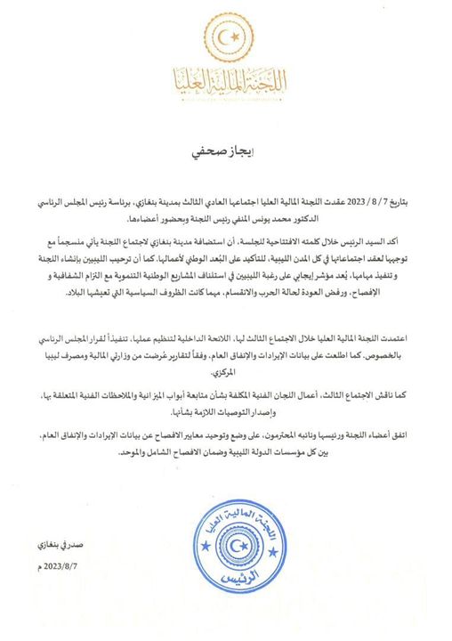 ترأس فخامة رئيس المجلس الرئاسي، اليوم الإثنين بمدينة بنغازي، الاجتماع الثالث للجنة الترتيبات المالية ومتابعة الإنفاق العام بحضور كامل أعضاء اللجنة.