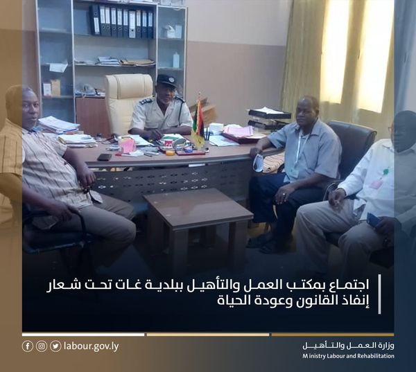 عقد اجتماع بمكتب العمل والتأهيل في بلدية غات ضم كلا من مدير المكتب ورئيس قسم التفتيش وأعضائه مع رئيس قسم الجوازات لتنسيق عقد اجتماعات دورية مع كافة الأجهزة لضبط تشغيل العمالة الوافدة وإجراء حملات تفتيشية على مواقع العمل المختلفة تماشيا مع خطوات التي تقوم بها الوزارة على المستوى الوطني لتنظيم سوق العمل.