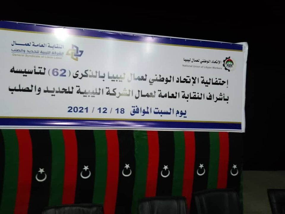 حضر عدد من النشطاء النقابيون ورؤساء النقابات العمالية القائمة والمهتمون بالحركة النقابية والعمالية في ليبيا أول من أمس الــ 18 من الشهر الجاري الاحتفال الذي نظمته واشرفت عليه بمصراتة، النقابة العامة لعمال شركة الحديد والصلب ، بمناسبة حلول الذكرى الثانية والستين لتأسيس الاتحاد الوطني لعمال ليبيا ،الأمر الذي استحوذ على تقدير المكتب التنفيذي بالاتحاد الوطنى عمال ليبيا لاهتمام النقابة العامة للعاملين بشركة الحديد والصلب وإقامة هذا الاحتفال بمناسبة هامة في تاريخ الحركة العمالية بليبيا .