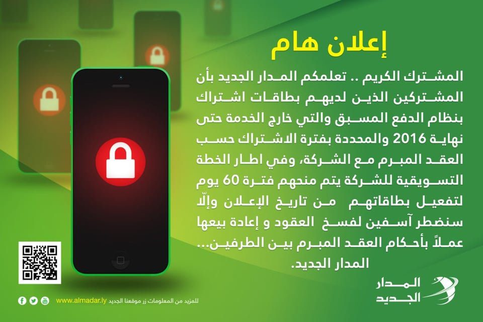 تعلمكم شركة المدار الجديد بأن المشتركين الذين لديهم بطاقات إشتراك بنظام الدفع المسبق والتي خارج الخدمة حتى نهاية 2016 والمحددة بفترة الإشتراك حسب العقد المبرم مع الشركة، وفي إطار الخطة التسويقية للشركة سيتم منحهم فترة 60 يوم لتفعيل بطاقاتهم من تاريخ الإعلان والا سنضطر آسفين لفسخ العقود و إعادة بيعها عملا بأحكام العقد المبرم بين الطرفين.