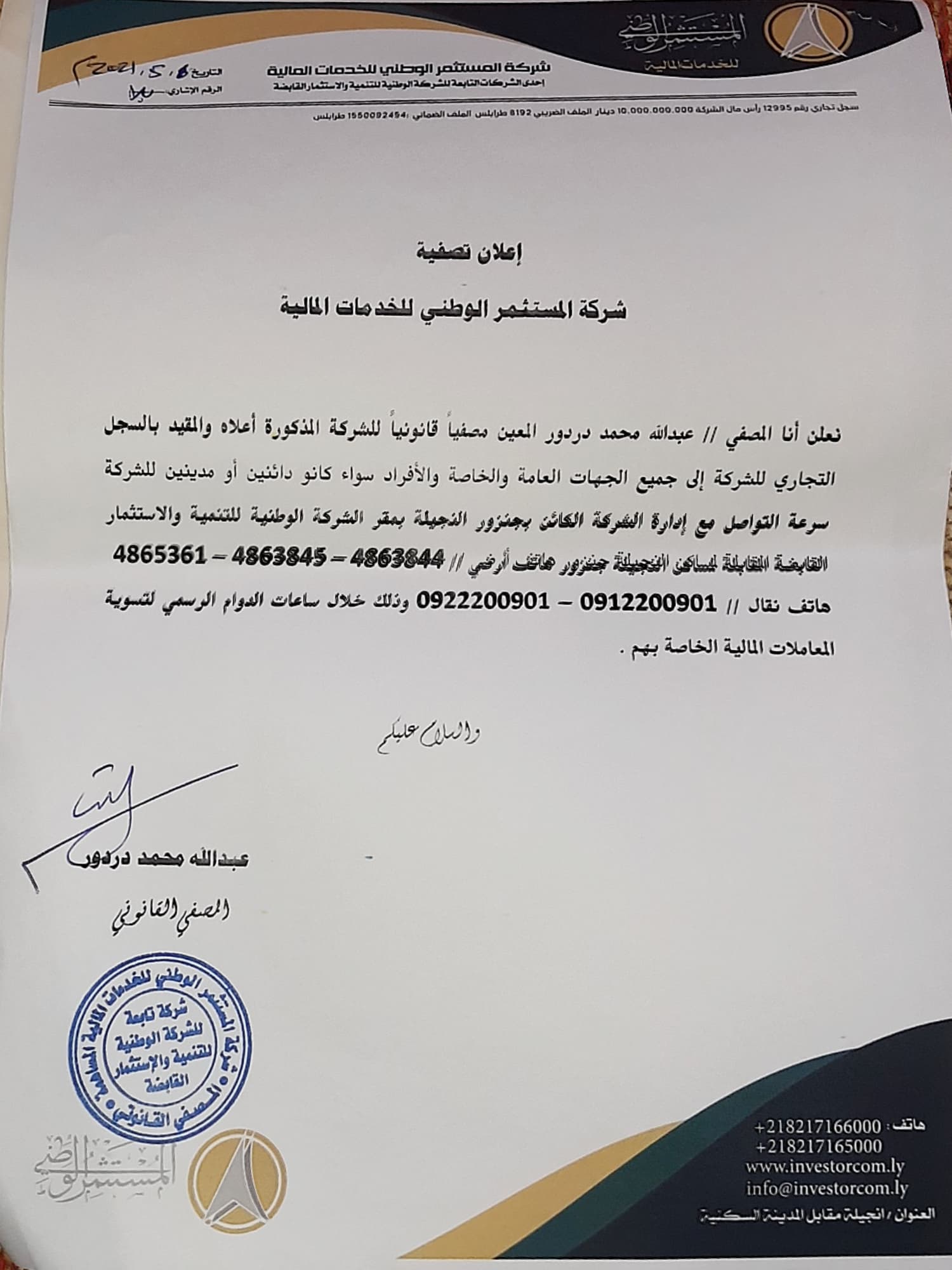 نعلن انا المصفي // عبدالله محمد دردور المعين مصفيا قانونياً للشركة المذكورة أعلاه والمقيد بالسجل التجاري للشركة الى جميع الجهات العامة والخاصة والافراد سواء كانو دائنين او مدينين للشركة سرعة التواصل مع إدارة الشركة الكائن بجنزور النجيلة بمقر الشركة الوطنية للتنمية والاستثمار القابضة المقابل لمساكن النجيلة جنزور هاتف ارضي /4863844- 4863845 – 4865361  وهاتف نقال // 0912200901 – 0912222901 – وذلك خلال ساعات الدوام الرسمي لتسوية المعاملات المالية الخاصة بهم والسلام عليكم