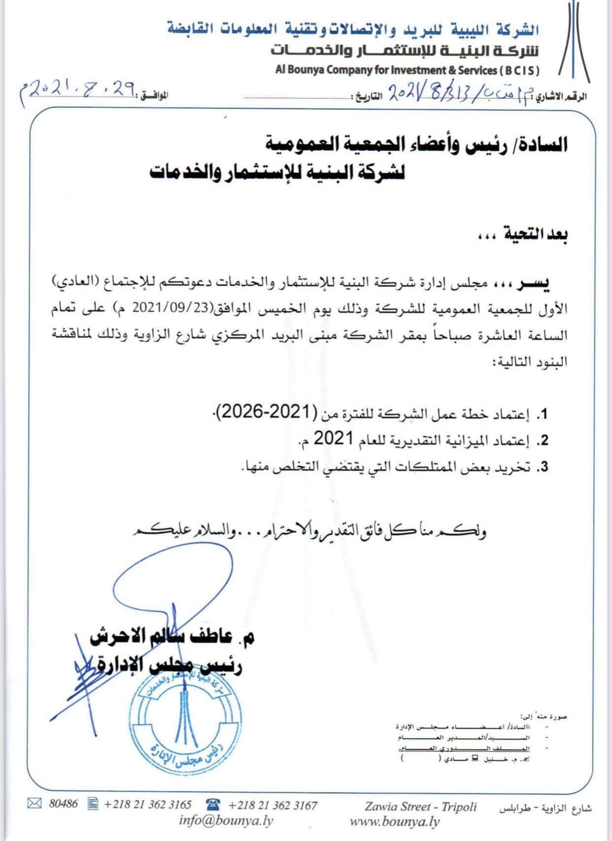 يدعوا مجلس ادارة شركة البنية للاسثتمار والخدمات السادة رئيس واعضاء الجمعية العمومية للشركة للاجتماع العادي الاول وذلك يوم الخميس الموافق 23 سبتمبر 2021م على تمام الساعة العاشرة صباحاُ بمقر البريد المركزي بشارع الزاوية لمناقشة البنود التالية: