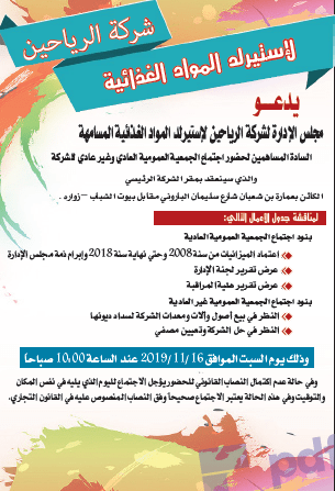 يدعو مجلس الإدارة لشركة الرياحين لإستيرلد المواد الغذائية المسامهة السادة المساهمين لحضور اجتماع الجمعية العمومية العادي وغير عادي للشركة والذي سينعقد بمقر الشركة الرئيسي الكائن بعمارة بن شعبان شارع سليمان الباروني مقابل بيوت الشباب – زواره .