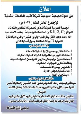 اعلان عن دعوة الجمعية العمومية لشركة المنيب للخدمات النفطية