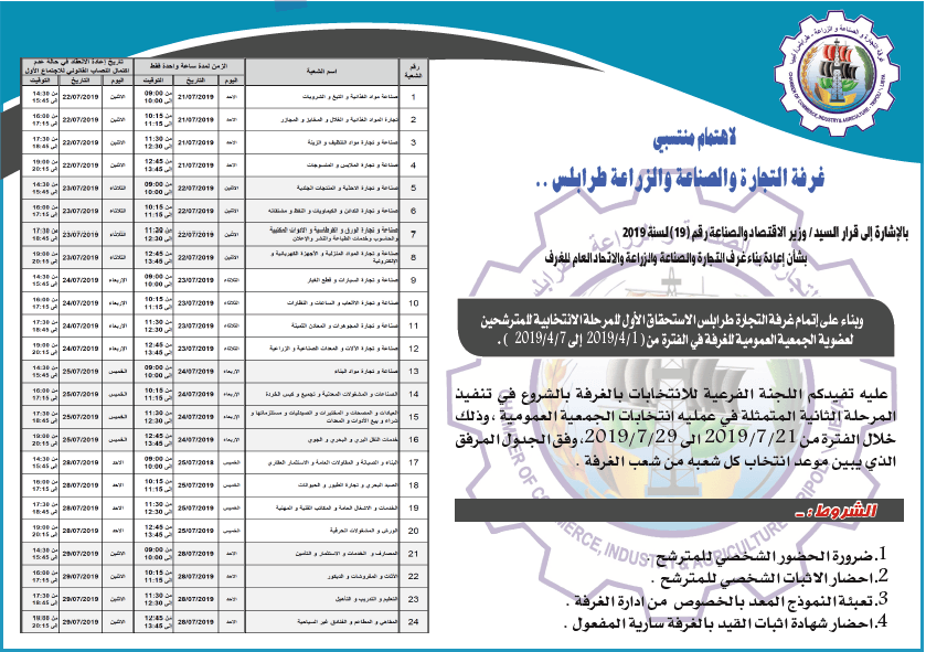 عليه تفيدكم اللجنة الفرعية للانتخابات بالغرفة بالشروع في تنفيذ المرحلة الثانية المتمثلة في عمليه انتخابات الجمعية العمومية ، وذلك خلال الفترة من 21/7/2019 الى 29/7/2019 وفق الجدول المرفق الذي يبين موعد انتخاب كل شعبه من شعب الغرفة