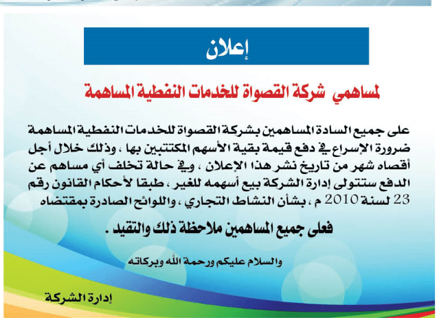 اعلان لمساهمي شركة القصواة للخدمات النفطية المساهمة