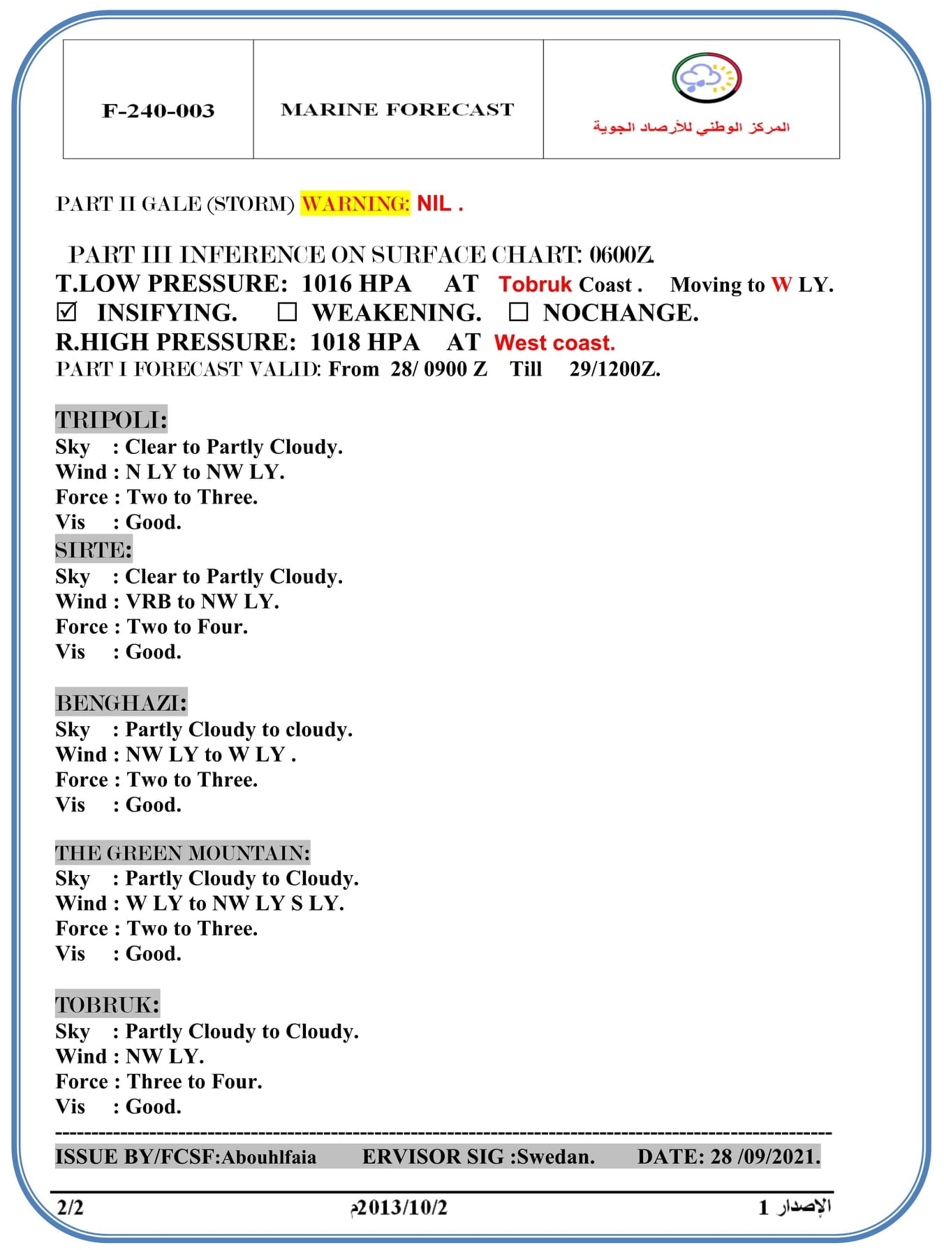•البحر هادئ الى خفيف الموج بشكل عام بينما يكون قليل الاضطراب هذا اليوم على ساحل درنة و طبرق.