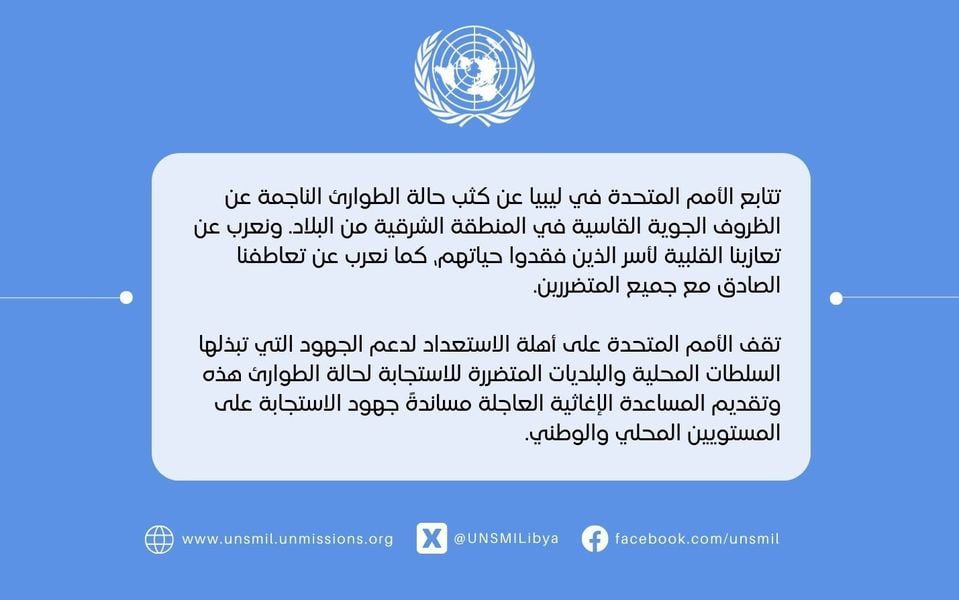 وأعربت الأمم المتحدة في بيان نشر على صفحة بعثتها في ليبيا عن تعازيها القلبية لأسر الذين فقدوا حياتهم، وتعرب عن تعاطفنا الصادق مع جميع المتضررين .