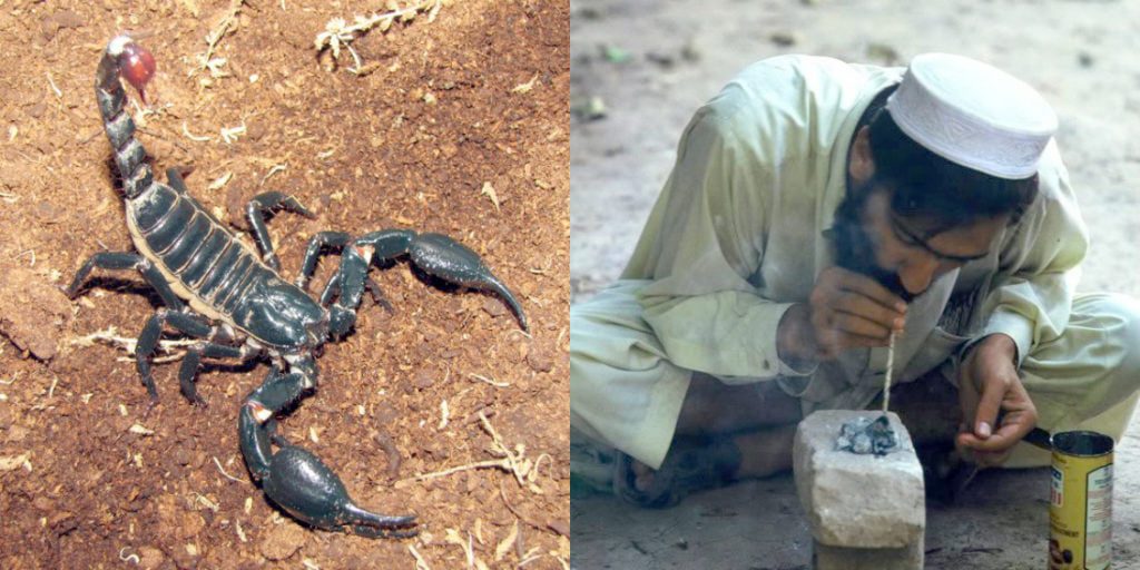 السكان المحليون يقومون بحرق العقارب ومن تم طحنها. تم يقومون باستنشاق دخانها، ويتم التركيز على منطقة الذيل التي تحتوي على السم.