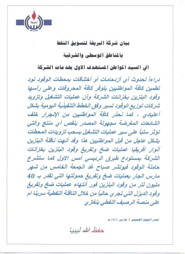 اصدرت مساء اليوم شركة البريقة لتسويق النفط بيان تحصلت صحيفة ليبيا الاخبارية على نسخة منه اكدت فيه ان الوقود متوفر وودعت المواطنين الى عدم التزاحم
