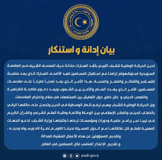 تدين الحركة الوطنية للشباب الليبي بأشد العبارات حادثة حرق المصحف الشريف في العاصمة السويدية استوكهولم تزامنًا مع استقبال المسلمين لعيد الأضحى المبارك الذي يعد مناسبةً للتسامح والتصالح والصفح والمحبة، هذا الأمر الذي يعد تعدياً صارخاً على مقدسات المسلمين، الأمر الذي يهدد السلم والأمن بين الشعوب ويعد دعوى فاضحة للكراهية والتعصب الديني و خلل خطير حول التعايش بين المجتمعات في سلام واحترام المقدسات.