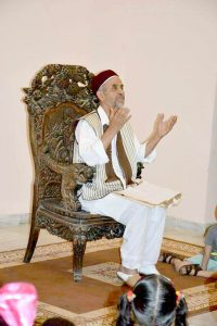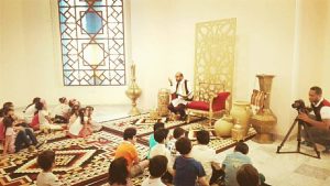 بهذه الجملة يبدأ الحكاواتي وهو جالس في كرسيه الخشبي الخاص به، في سرد قصصه للأطفال بمني الدعوة الإسلامية بميدان الجزائر بالعاصمة طرابلس.