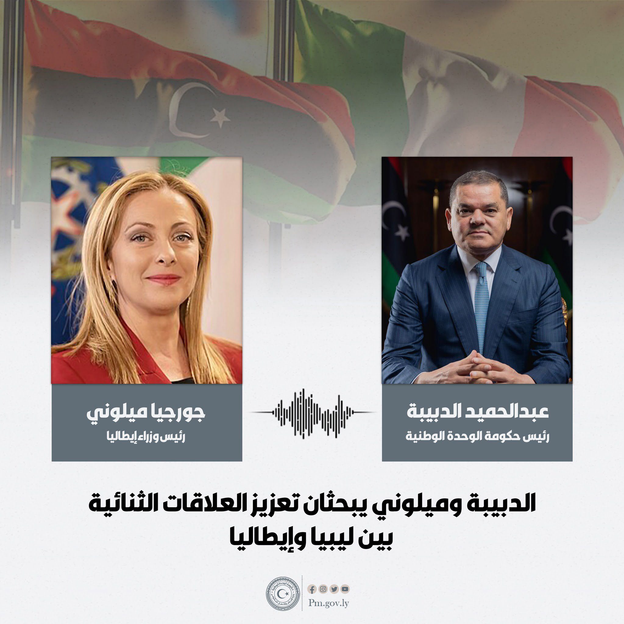 بحث رئيس حكومة الوحدة الوطنية ” عبد الحميد الدبيبة “ مع نظيرته الإيطالية ” جورجيا ميلوني ” خلال اتصال هاتفي مساء اليوم الأربعاء، تعزيز العلاقات الثنائية بين البلدين وتنسيق الجهود الإيطالية في دعم المناطق المنكوبة شرق البلاد.