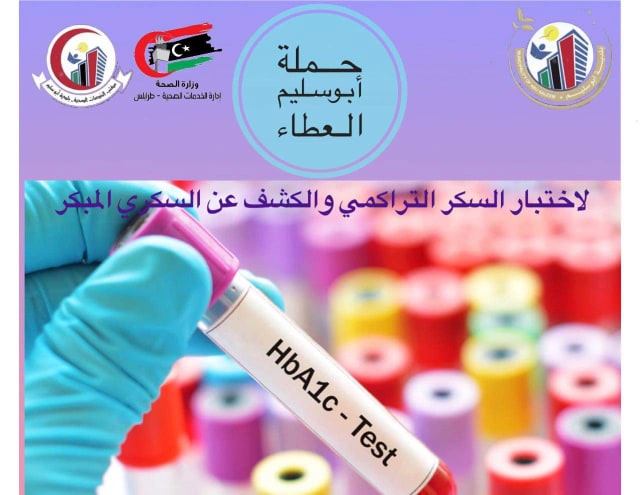 بالتعاون مع قسم المختبرات بإدارة الخدمات الصحية طرابلس يطلق مكتب الخدمات الصحية “أبوسليم” غد السبت حملة ” أبوسليم العطاء ” لاختبار السكر التراكمي و الكشف المبكر عن السكري ، بالمركز الصحي خالد بن الوليد على مدار يومين متتاليين 11-12-4 2020م قابله للتمديد.