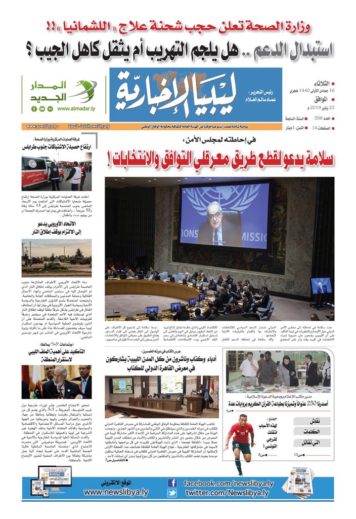 صدر صباح اليوم الثلاثاء الموافق 22 يتاير 2019 العدد 538 لصحيفة ليبيا الاخبارية