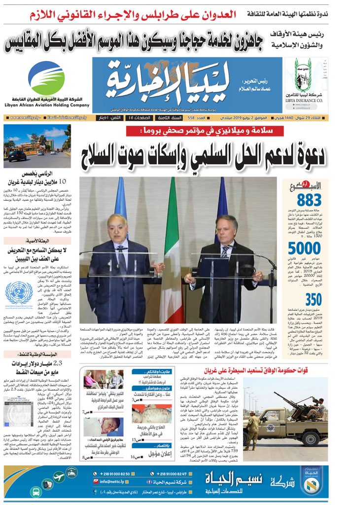 يصدر الثلاثاء الموافق 2 يوليو 2019 العدد (558) لصحيفة ليبيا الاخبارية ، العدد حافل بالاخبار والمتابعات واللقاءات والتحقيقات معززاً بأراء أبرز الكتاب والصحفيين
