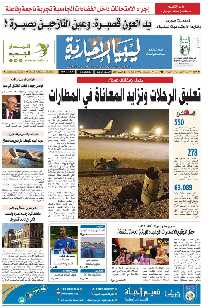 يصدر صباح الغد الثلاثاء 20 أغسطس 2019 العدد (563) لصحيفة ليبيا الإخبارية