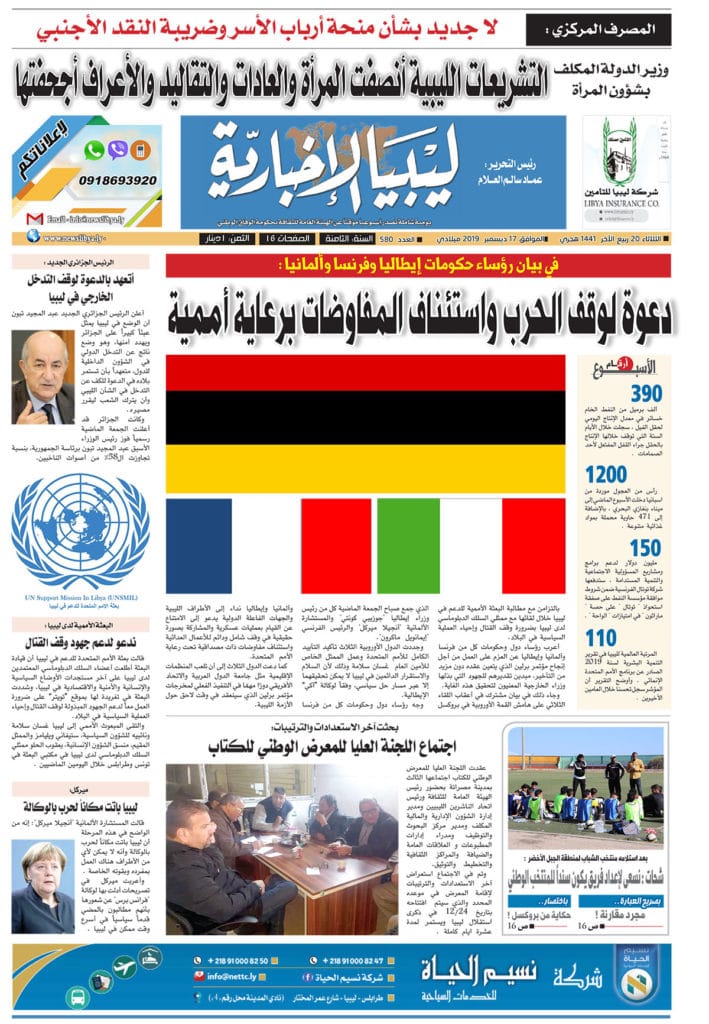 يصدر صباح الثلاثاء 17 ديسمبر 2019 العدد (580) لصحيفة #ليبيا #الإخبارية