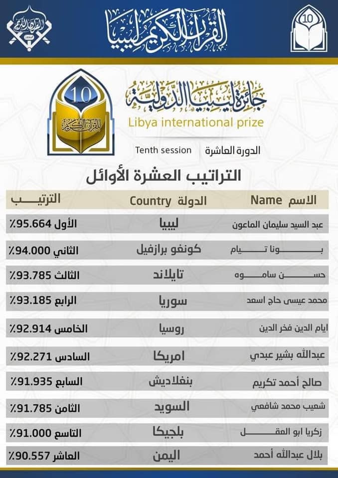 القارئ الليبي ( عبد السيد الماعون ) يفوز بالترتيب الاول في مسابقة جائزة ليبيا الدولية للقرآن الكريم في نسختها العاشرة التي نظمت ببنغازي.