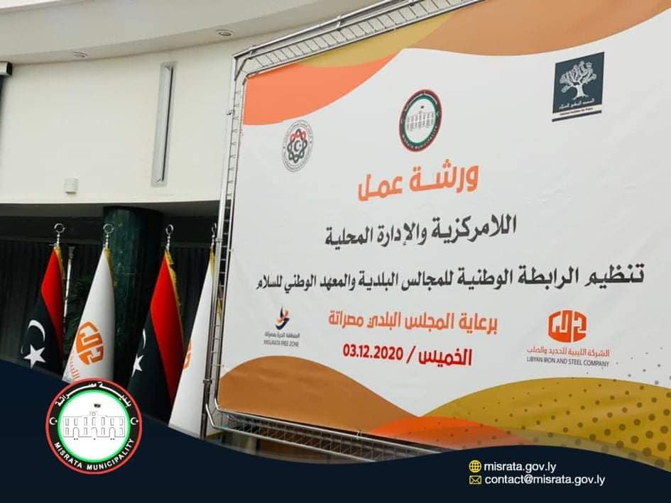 أقيمت يوم الخميس الماضي بقاعة الشركة الليبية للحديد والصلب بمصراته ورشة عمل بعنوان: ” اللامركزية والإدارة المحلية “، نظمتها الرابطة الوطنية للمجالس البلدية والمعهد الوطني للسلام، وذلك برعاية بلدية مصراته. وحضر فعاليات هذه الورشة عدد من عمداء وأعضاء بلديات المناطق الغربية والجنوبية والوسطى، ومن مؤسسات المجتمع المدني مصراتة، وبعض النشطاء والفاعلين والمهتمين بالبلدية.