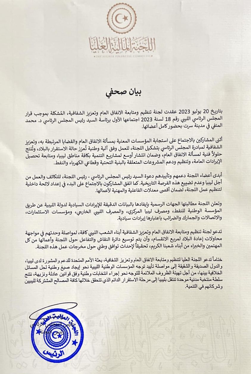بتاريخ 20 يوليو 2023 عقدت لجنة تنظيم ومتابعة الانفاق العام وتعزيز الشفافية، المُشكلة بموجب قرار المجلس الرئاسي الليبي رقم 18 لسنة 2023 اجتماعها الأول برئاسة ” رئيس المجلس الرئاسي ” محمد المنفي ” في مدينة سرت بحضور كامل أعضائها.