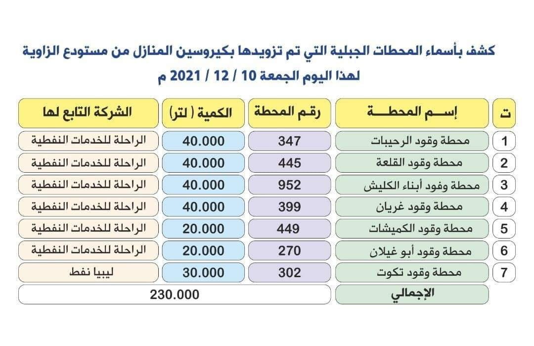 شرع مستودع الزاوية النفطي بتزويد شركات التوزيع بمنتج كيروسين المنازل لتوزيعها على المحطات التابعة لها و الواقعة بمناطق الجبل الغربي، و المعلن عنها من خلال الصفحة الرسمية لشركة البريقة المزمع تزويد المحطات بها اليوم.