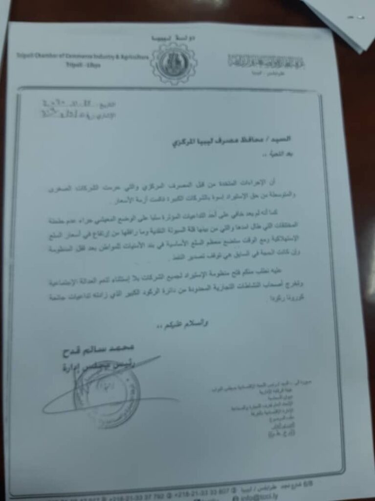تلقت غرفة التجارة والصناعة والزراعة طرابلس مراسلة من مصرف ليبيا المركزي ردا على الرسالة الموجهة للسيد الصديق الكبير محافظ المصرف المركزي من قبل السيد محمد قدح رئيس مجلس إدارة غرفة التجارة بتاريخ 14 ديسمبر الماضي ، والتي تضمنت مطالب مزاولي النشاط الاقتصادي الخاص من منتسبي الغرفة التي أقروها في اجتماعهم الجامع المنعقد بتاريخ 30 نوفمبر 2020 والمتمثلة في ضرورة حلحلة المشاكل المترتبة على قفل منظومة الاعتمادات المستندية وحصرها في عدد محدود من السلع ، الأمر الذي أضر بشكل كبير بصغار التجار ، مثلما تسبب في ارتفاع غير معهود في السلع الأساسية .