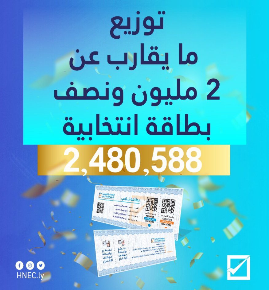 أعلنت المفوضية الوطنية العليا للانتخابات انتهاء عملية توزيع بطاقة الناخب ، التي انطلقت يوم 8 نوفمبر 2021 و إنتهت في 1 ديسمبر2021، باستلام المواطنين (2,480.588 بطاقة ناخب وناخبة)، تأهلهم للمشاركة في كل الاستحقاقات الانتخابية المقبلة.
