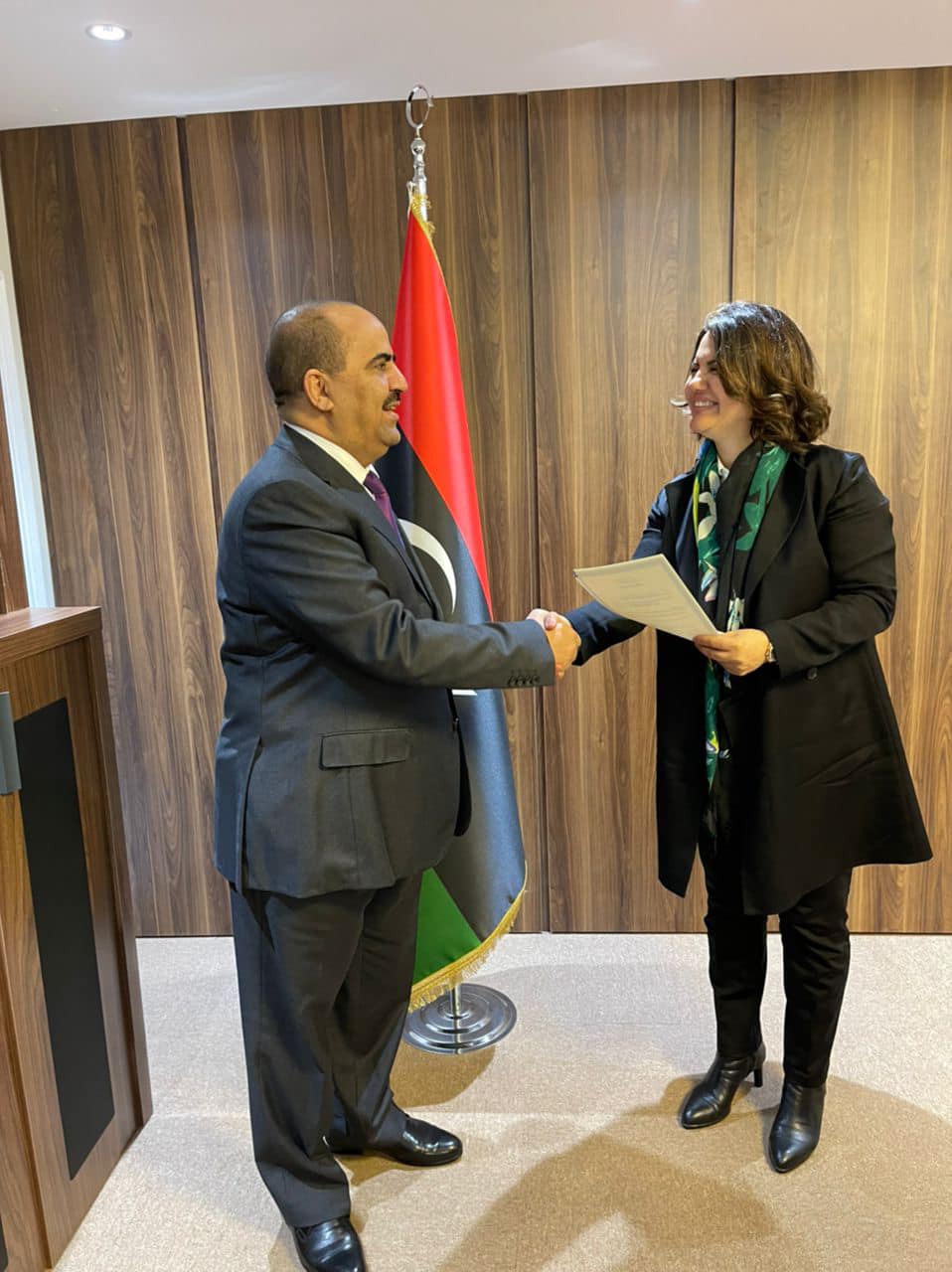 قدم السفير الجزائري الجديد ” سليمان شنين “، نسخة من أوراق اعتماده سفيرا لبلاده لدى ليبيا لوزيرة الخارجية والتعاون الدولي، “نجلاء المنقوش” لدى استقبالها له اليوم الاحد بمقر الوزارة بالعاصمة طرابلس.