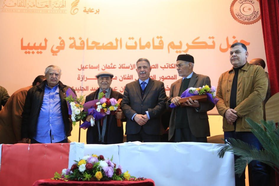 في باردة تنم عن الوفاء لمن أعطى وأفنى زهرة شبابه خدمة لمهنة الصحافة، وفي جو أسري التقى فيه زملاء مهنة المتاعب، أقامت الهيئة العامة للثقافة مساء اليوم السبت حفل تكريم قامات الصحافة في ليبيا” ” عثمان اسماعيل” ” محمد كرازه”،” عبدالحميد الجليدي”، بحضور كل من السادة رئيس الهيئة العامة للثقافة “حسن اونيس”، وزير المواصلات ” ميلاد معتوق”، وكيل وزارة الداخلية العميد “خالد مازن” وعميد كلية الفنون والإعلام ” عبدالكريم كندير” ، ولفيف من الصحفيين والمثقفين والأدباء والإعلاميين .