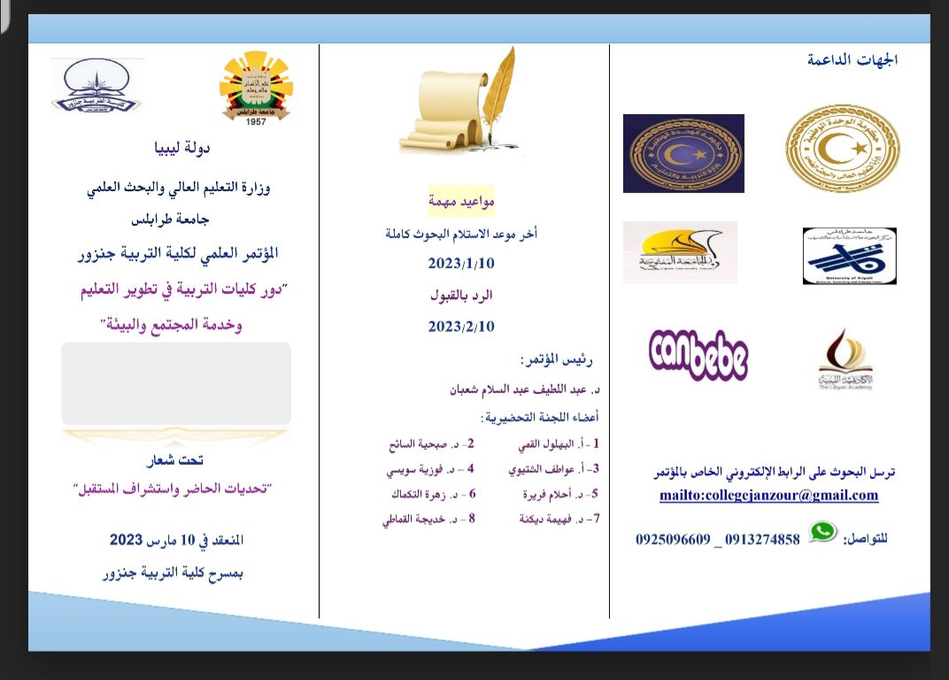 بدأت كلية التربية بجنزور رسمياً الاستعدادات والتجهيزات وخطواتها التنفيذية، لتنظيم المؤتمر العلمي حول دور كليات التربية في تطوير التعليم وخدمة المجتمع والبيئة، الذي ستنظمه الكلية خلال شهر مارس القادم، تحت شعار “تحديات الحاضر واستشراف المستقبل”.