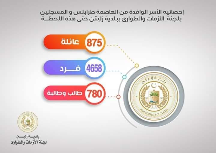 أعلنت لجنة الأزمات والطوارئ ببلدية زليتن أن عدد المسجلين لدى البلدية من النازحين من طرابلس بسبب الاشتباكات وصل الى 875 عائلة . وأوضحت في بيان لها على صفحتها بــ ” فيسبوك ” أن العدد الإجمالي للنازحين المسجلين لديها بلغ 4658 شخصا منهم 780 طالب وطالبة بمراحل التعليم المختلفة .