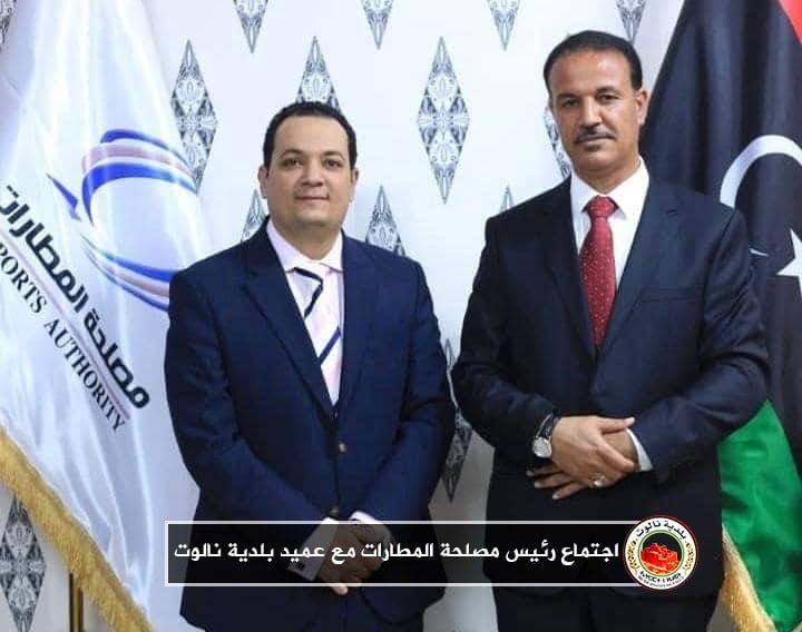 اجتمع الثلاثاء الماضي السيد رئيس مصلحة المطارات د. محمد بيت المال مع عميد بلدية نالوت د. عبدالوهاب الحجام حيث كان محور الاجتماع الذي انعقد بمقر المصلحة تقديم مقترح من طرف البلدية لتطوير المهبط الحالي بالمدينة واستخدامه كمطار مدني يتم تنفيذه بشكل استثماري من خارج مخصصات الميزانية العامة وتحت إشراف مصلحة المطارات.
