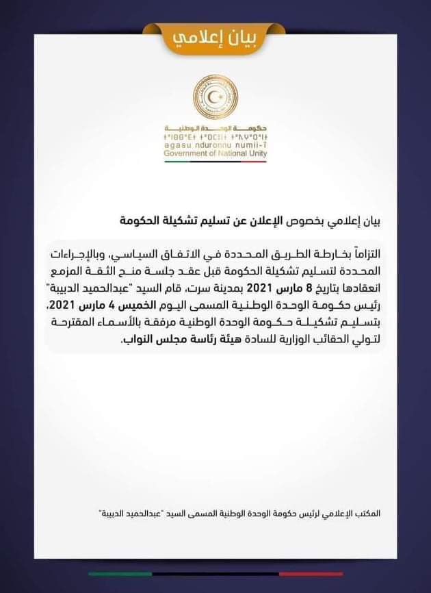 بيان اعلامي لحكومة الوحدة الوطنية يؤكد تسليم تشكيلة الحكومة الوطنية للبرلمان … لمناقشتها في 8مارس الجاري