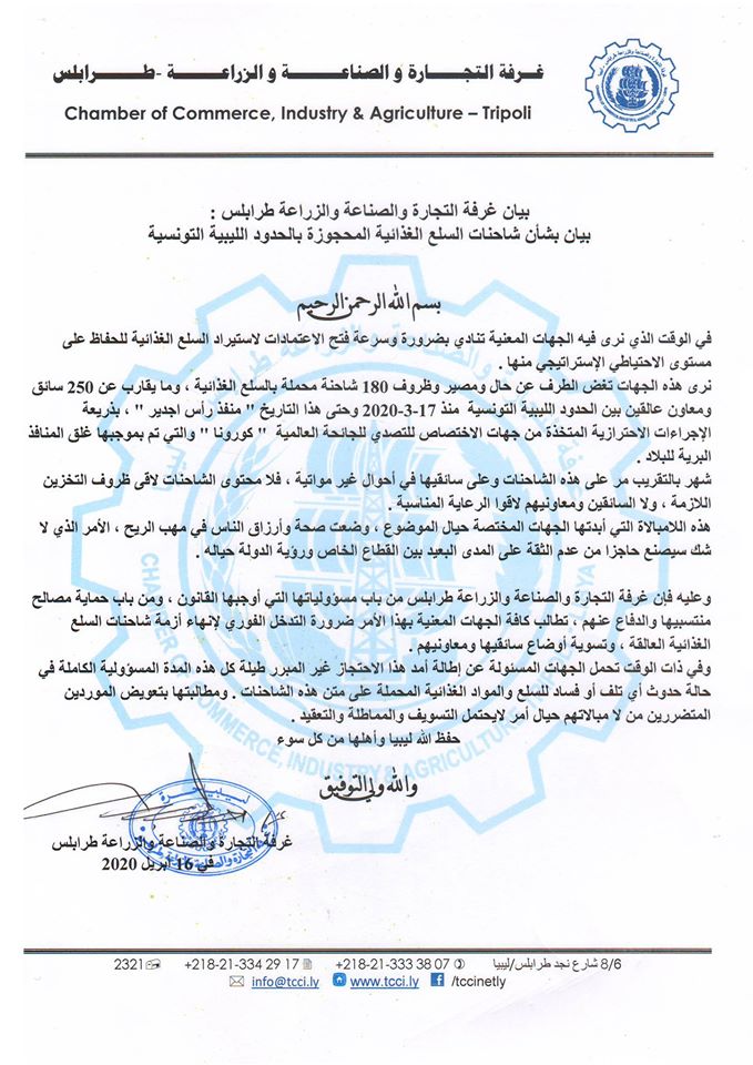 بيان غرفة التجارة والصناعة والزراعة طرابلس بشأن شاحنات السلع الغذائية المحجوزة بالحدود الليبية التونسية