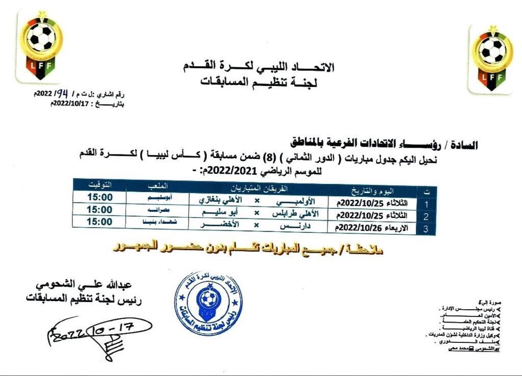 اعلنت لجنة تنظيم المسابقات بالاتحاد الليبي لكرة القدم عن مواعيد وملاعب مواجهات كأس ليبيا في دور ربع نهائي .