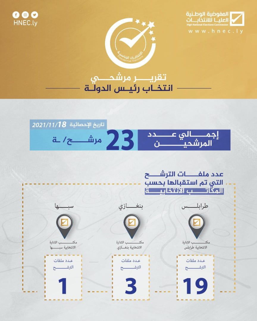 وبهذا يصبح العدد الكلي لأعداد المرشحين (23) مرشحاً، وتجدر الإشارة إلى أن قبول الملفات يُعد قبولاً مبدئياً، وسوف تحيل المفوضية ملفات المتقدمين للترشح إلى كل من النائب العام، وجهاز المباحث الجنائية، والإدارة العامة للجوازات والجنسية، وذلك عملاً بالقانون رقم (1) لسنة 2021 بشأن انتخاب رئيس الدولة، للفصل في مدى مطابقة بياناتهم للشروط المحددة في القانون. وعقب ذلك سوف تعلن المفوضية عن القوائم الأولية بوسائل الإعلام وموقعها الرسمي.